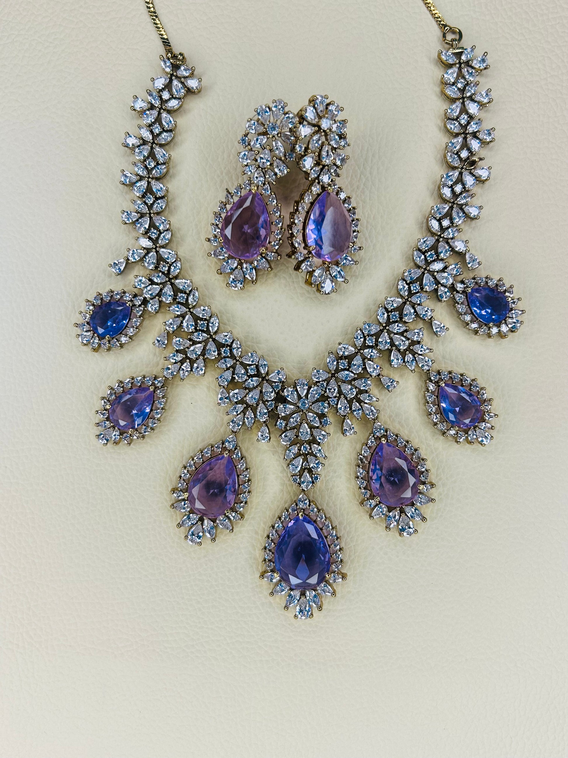 Turn heads with this exquisite amethyst and diamond necklace set, expertly crafted to showcase a dazzling array of pear-shaped violet gems surrounded by radiant diamonds, all perfectly set in a classic silhouette. Whether paired with an evening gown or as the highlight of a special celebration, this necklace brings luxury and sophistication to every look.