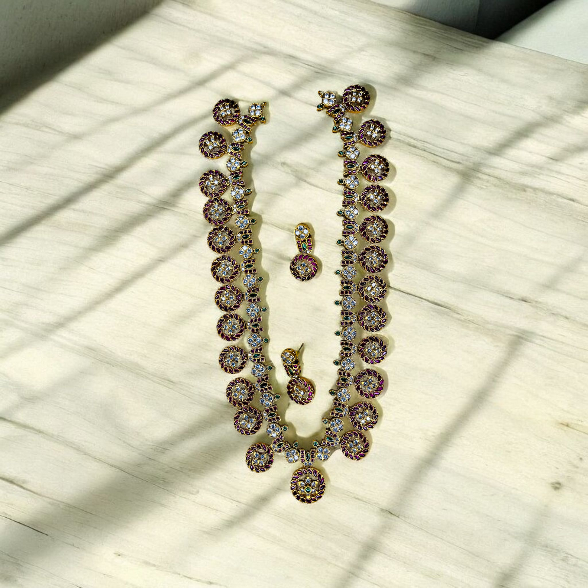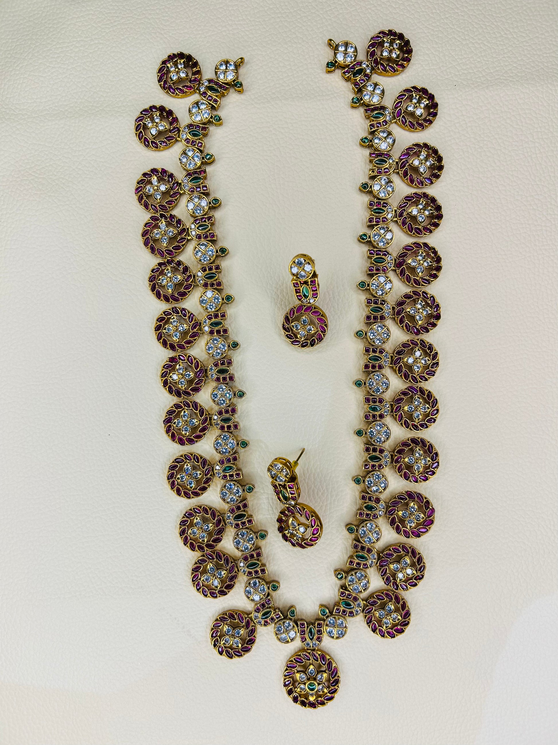 Make a regal statement with this exquisite double layered Kundan Polki necklace set, featuring intricately designed circular motifs and shimmering stones. The ornate craftsmanship paired with classic elegance creates a timeless accessory, ideal for weddings, festive gatherings, or special occasions. Each layer showcases a harmonious blend of traditional artistry and contemporary finesse, complemented by matching earrings. Enhance your ethnic wardrobe with this majestic piece and captivate attention at every celebration